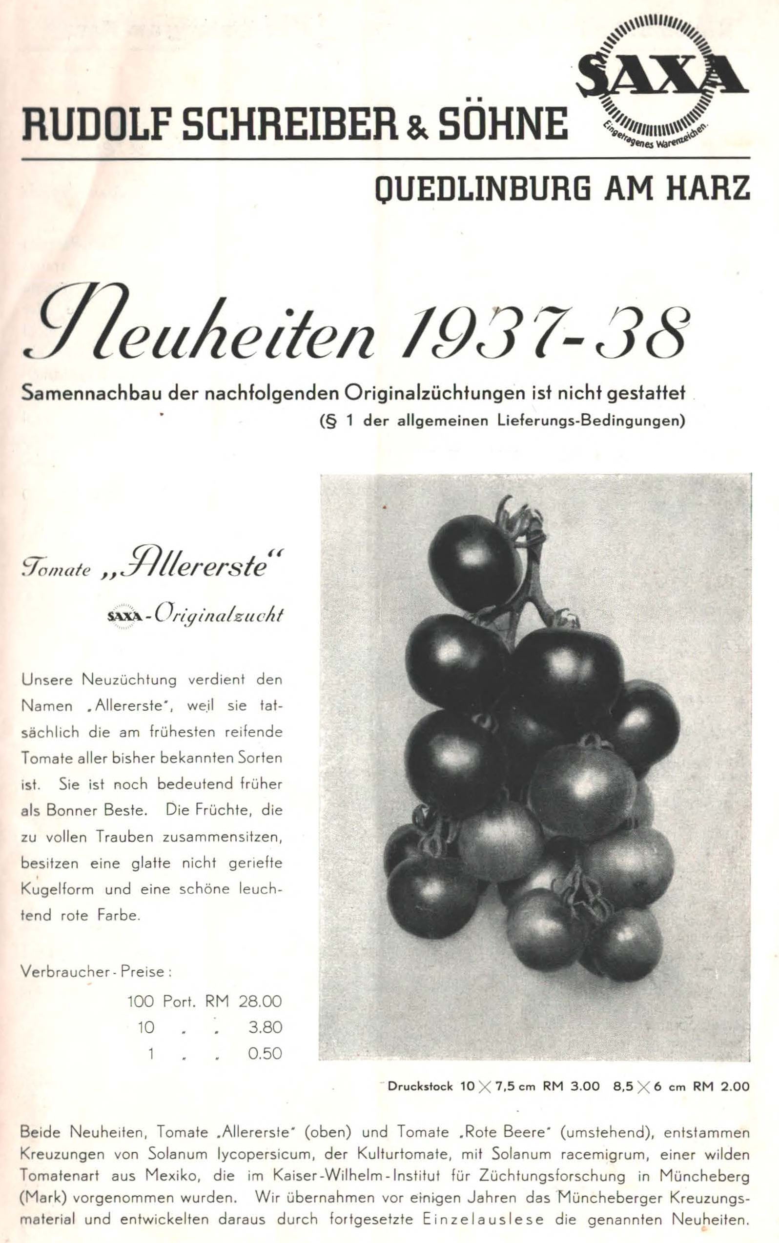 Bereits vor 1910 befand sich die Sorte ‘Goliath‘ der Firma David Sachs im Handel. Erstmals ausgestellt und als hervorragende Gemüsesorte bezeichnet wurde sie auf der Gemüse-Ausstellung des Vereins zur Beförderung des Gartenbaues in Berlin 1910. Weitere Tomatensorten sind ‘Allererste‘ und ‘Rote Beere‘, die ab 1937 in den Handel gelangten. ‘Schreibers Priora‘ wurde im Katalog 1938 erstmalig erwähnt. 1940 befand sich die Sorte ‘Braunfleckfeste Treib‘ in Prüfung bei der Sortenregisterstelle, erhielt aber keine Sortenzulassung. Leider gelten auch hier alle Sorten als verschollen. Der von jüdischen Glauben zum Protestantismus konvertierte Inhaber Hans Sachs galt in der Nazizeit als Jude. Um einer Arisierung (Enteignung) zu entgehen, überschrieben er und seine Schwester Henriette Jacobs, geb. Sachs, ihre Anteile auf Rudolf Schreiber, der bereits 1900 in das Unternehmen David Sachs als Züchter und Mitinhaber eingetreten war. 1942 musste die Ehefrau Elsbeth Sachs ihre restlichen Anteile auch an Rudolf Schreiber übertragen, der nun neuer Allein-Inhaber wurde. Er firmierte bis zur Enteignung 1945 unter dem Namen Rudolf Schreiber & Söhne (Abb.1).