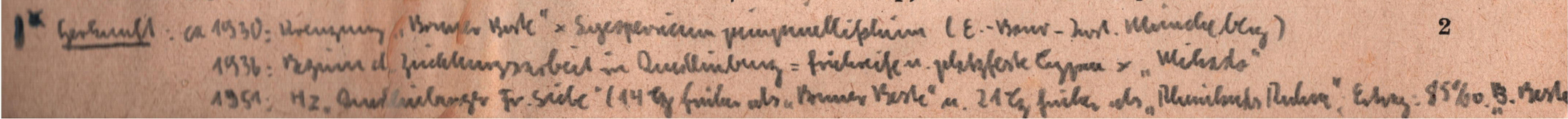 1936: Beginn der Züchtungsarbeit in Quedlinburg = frühreife u. platzfeste Typen x „Mikado“